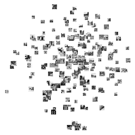 Basé sur un lexique architectural et urbanistique, chaque requête génère un nouveau groupement d’images et de textes. Après une extraction des caractéristiques, les images sont représentées sous forme de vecteurs en haute dimension. Ces vecteurs sont ensuite réduits pour être visualisés dans un espace bidimensionnel qui ré-organise les images selon leurs contenu. Les textes sont analysés par fréquence de mots et visualisés en nuage, permettant de visualiser les termes qui apparaissent le plus autour de la requête.